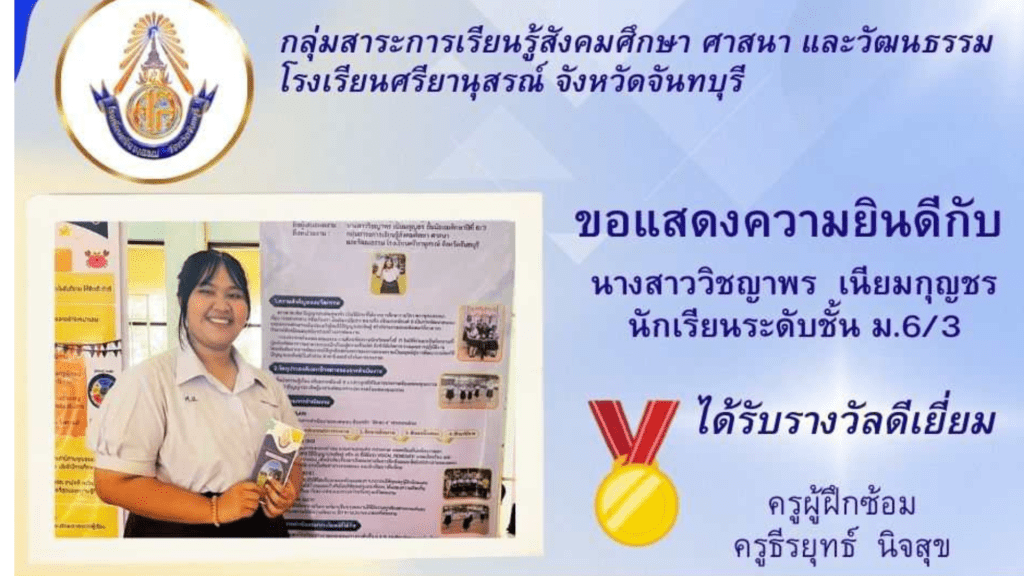 ขอแสดงความยินดีกับนางสาววิชญาพร เนียมกุญชร นักเรียนชั้นมัธยมศึกษาปีที่ 6/3 ได้รับรางวัลดีเยี่ยม การประกวดผลงานหนึ่งนักเรียนหนึ่งความรู้ ณ โรงเรียนคลองใหญ่วิทยาคม จังหวัดตราด วันที่ 2 สิงหาคม 2567